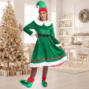 Women’s Christmas Elf Costume Dress with Hat, Belt, Stockings & Shoes Set