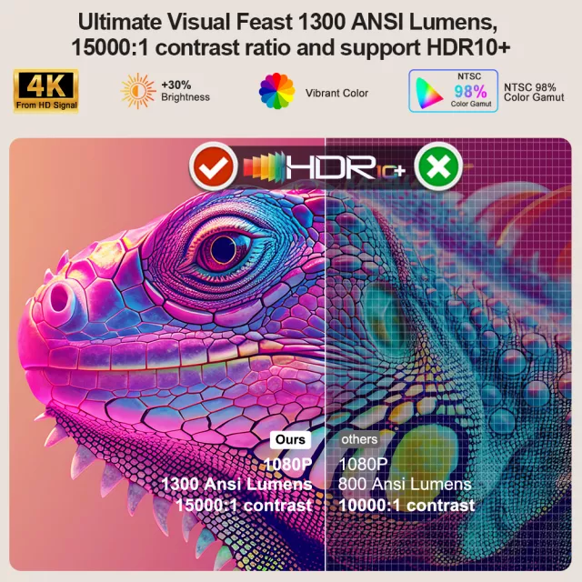 Enjoy bright, vibrant images thanks to its high 16000-lumen output and 1300 ANSI brightness. A sharp 15000:1 contrast ratio ensures deep blacks and bold colors, while advanced LCD technology enhances clarity in every frame. With screen sizes from 40 to 100 inches, you can enjoy cinematic visuals even in modest spaces. Auto focus, auto keystone, intelligent screen adjustment, and obstacle avoidance make setup effortless—just power it on and watch it perfectly optimize your display within seconds.