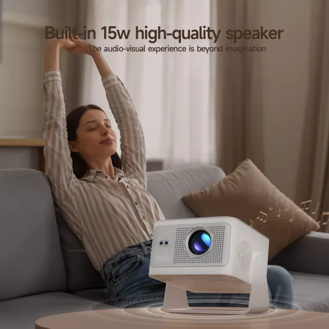 Project images from 30 inches to 300 inches for a true cinema-size screen. With short throw capability, you get massive display sizes from a shorter distance, ideal for rooms of all sizes. The 15-watt built-in speaker delivers rich, clear sound, while Bluetooth 5.4 lets you connect wireless headphones or external speakers for an even deeper experience.