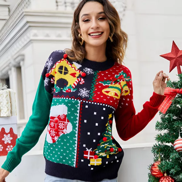 Bring instant holiday cheer to your wardrobe with this women’s ugly Christmas sweater designed to make you feel cozy, confident, and completely in the festive spirit. Featuring a playful Christmas tree and bell print with bold color blocking, this pullover is perfect for women who love fun fashion without sacrificing comfort. The loose fit gives you easy movement all day long, while the soft knit fabric keeps you warm through chilly fall and winter days.